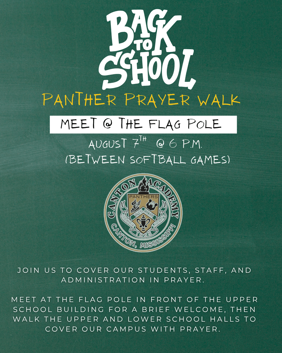 We’ll also meet that evening for a Prayer Walk as we come together to pray over our students, faculty, staff, and campus. This will take place starting at 6 pm (in between softball games) on August 6th. Flyer is attached.