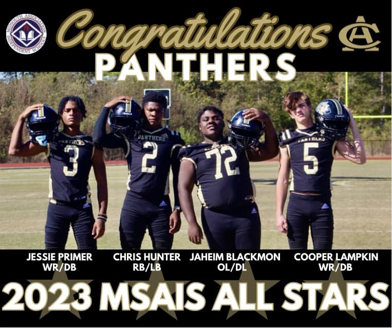 Congratulations to seniors Jaheim Blackmon, Chris Hunter, Cooper Lampkin and Jessie Primer on being selected to the 2023 MSAIS All-Star football program. The 1A-2A-3A All Star game will take place at Jackson Prep on Friday, December 1 at 2:00 pm.